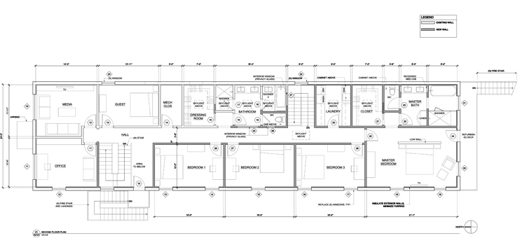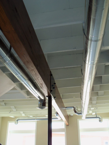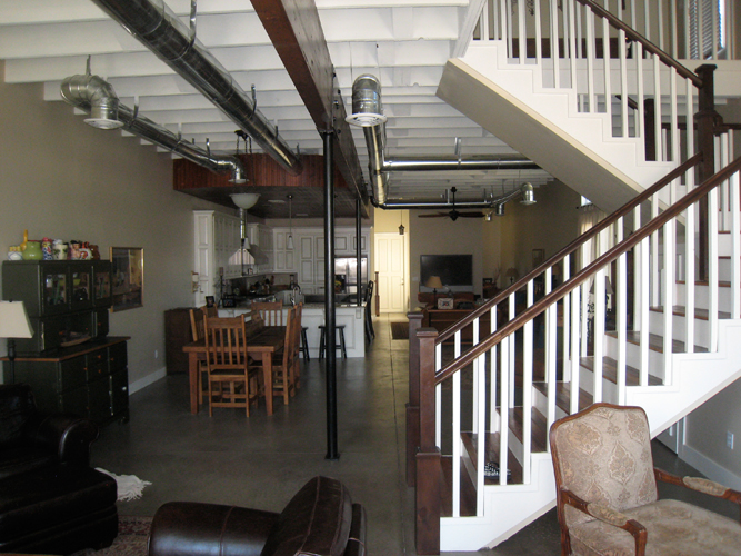 The design sought to create an open, loft layout of the ground floor living, dining, kitchen and den areas. Four bedrooms and home office occupy the second floor. The budget was minimal at $60 a square foot. Flooring consisting of bare concrete on the ground floor and reclaimed wood on the second floor. Exposed duct work and ceiling framing add to the character of the space.