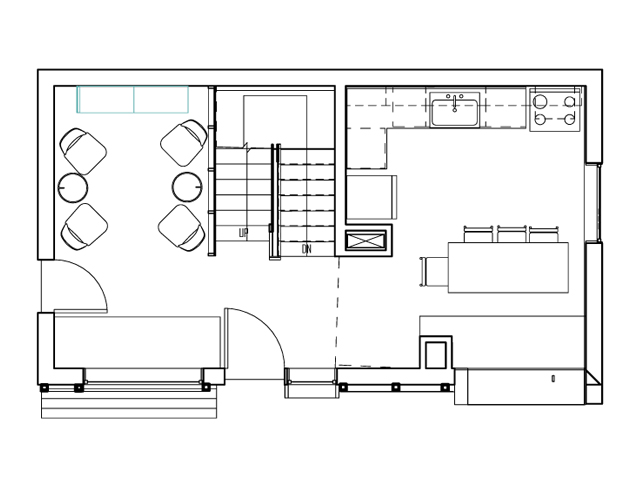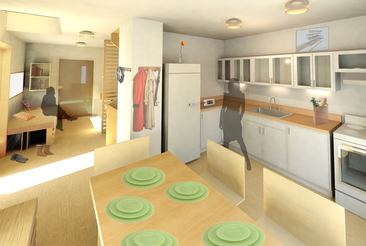 Efficiency was achieved by developing a centralized core which maximized the available living space. Cost savings were achieved by using off the self materials, such as plywood as both a structural and finish material. For the design team, “Environmental Consciousness” extended well beyond the LEED standards and extended to include community awareness. This was accomplished by making the site aimed to be more porous, both physically and socially. The site plan removed the asphalt that once covered the entire site and replaced it with pavers and vegetation that will help absorb and rain and creek run off. Socially, the project strengthens its community connection by formalizing the path through the site, facilitating access to public transportation, while the new gardens provide a place for community gatherings.