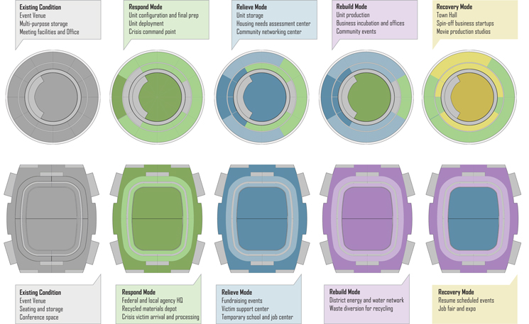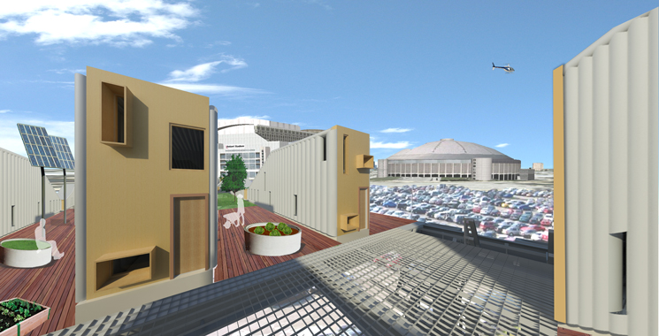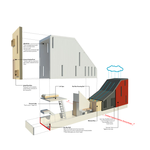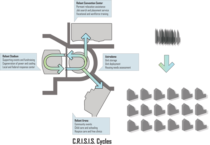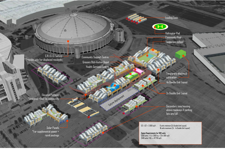 C.R.I.S.I.S. heightens the value of community during times of need. Potential configurations allow for the clustering or agglomeration of units in communal pods. With shared amenities including a rainwater collecting courtyard, district cogeneration of heat and power, and play yards for children, the C.R.I.S.I.S. community evolves through time to inherit the combined identity and norms of its inhabitants. Furthermore, local manufacture, assembly, storage and customization present new opportunities for corollary organic business development and job creation. Spinoff businesses will not only feed the supply chain of sustainable material suppliers in the production of units, but also provide new job opportunities for the displaced.