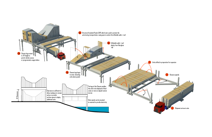 C.R.I.S.I.S. presents an adaptable mobile foundation framework doubling as the transport trailer. The adjustable S.C.A.F.FOLD chassis is deployable on a range of site and soil conditions including flood prone riparian zones, waterlogged roadways and over existing urban streets, allowing rebuilding of adjacent properties to continue seamlessly while refugees are never dislocated far from their true home.