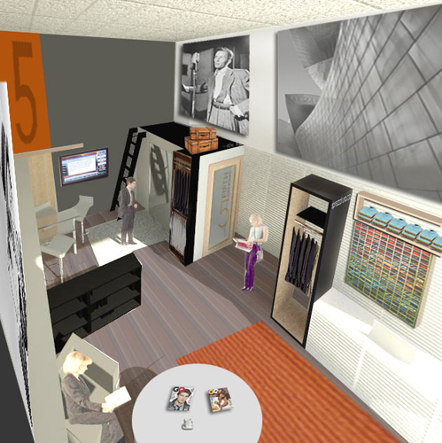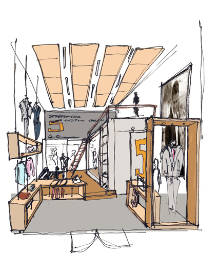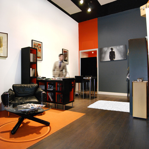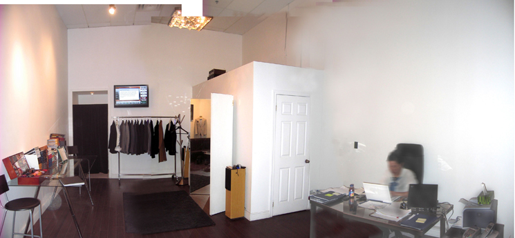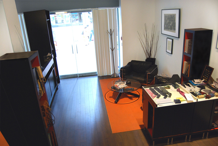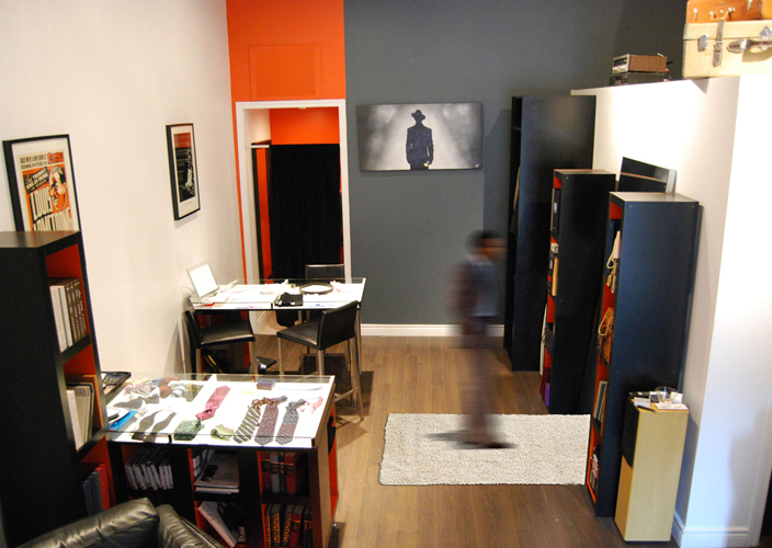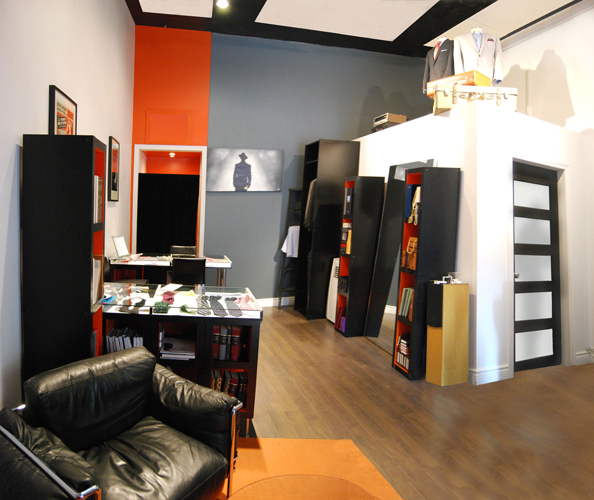 The modest budget was maintained through ‘customization‘ of off-the-shelf components. Using their signature colors, the furniture and show room were painted to reinforce the brand. The ‘professional’ black was lined with ‘fun’ orange interiors drawing reference to the ‘serious’ exterior fabrics vs. ‘funky’ linings of their famous suits.