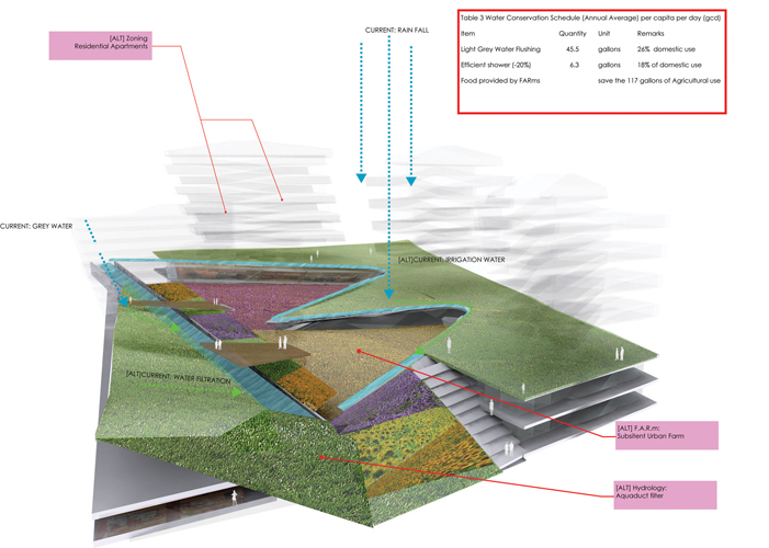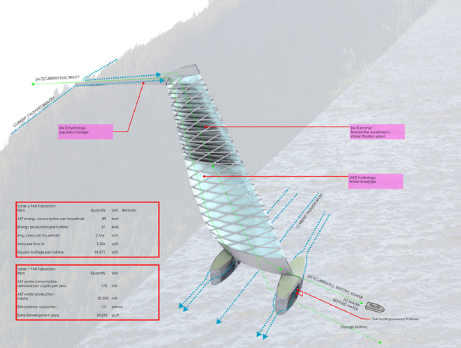 Water remains an un-realized resource within Yonkers. Simultaneously, impacts on ecological and hydrological systems to the Hudson and Sawmill Rivers have become an escalating issue. As a peripheral entity to the metropolis of Manhattan, Yonkers is bypassed by valuable infrastructure and resources derived from regional flows. The challenge becomes to capitalize on Yonkers inherent hydrological potential (k) to derive a more prominent local flow from the region and in turn returning the [ALT]ered flow to participate in the ebbs of regional exchange. The project proposes hydro-focused urban strategies which catalyze the topography to maximize the waters potential and serves as a prototype for future urban development.