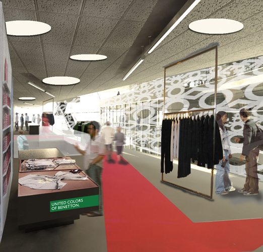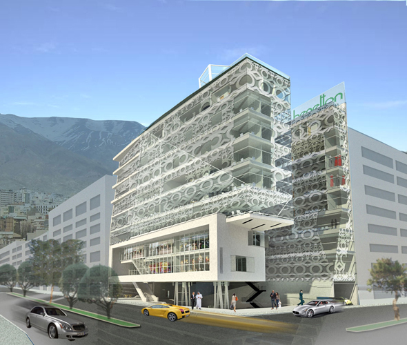 In Persian culture, geometrical designs convey an aura of spirituality and transcendent beauty. The building harnesses this sensibility by manipulating the Benetton logo to develop a harmonious fritting pattern along the curtain wall. The translucent film enables natural light to fill the building yet reduces direct heat from the sun. The fritting is is symbolic of a jali screen, a common feature in traditional Islamic architecture. The screening offers privacy to the buildings tenants while strategic cuts within the pattern offer glimpses of activity and frame majestic panoramic views of the City. The prominent, mixed use complex would serve as the headquarters and retail location for the United Colors of Benetton in Iran.