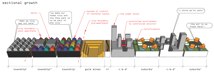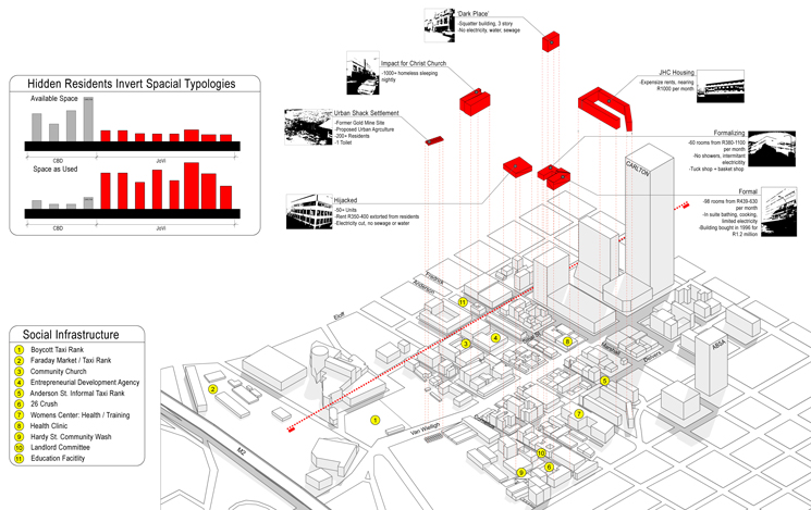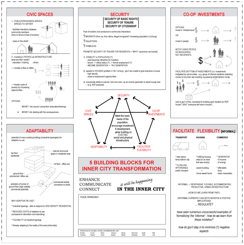 We re-wrote the Jozi -Johannesburg's city map, which currently highlights the pillar inner city regeneration strategy, and generated our own building blocks for inner city transformation.